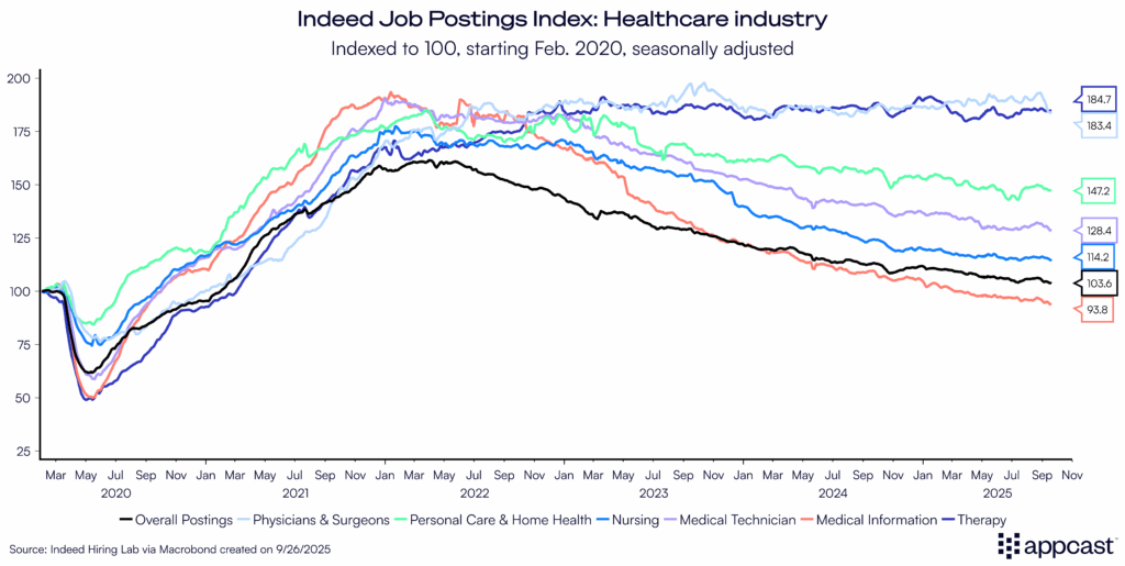 Other standing up jobs are either thriving or down just modestly, according to Indeed data. Retail is perhaps the one big exception, with tariff effects clouding its outlook. Recruiting and TA leaders should expect continued scarcity in direct care, skilled trades, and site-based operations roles.