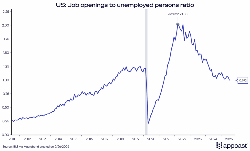 A symbolic marker was crossed in September: the number of unemployed individuals exceeded job openings for the first time since April 2021; but if you exclude the pandemic-era fluctuations, this goes back to February 2018. The driving factor behind this flip in the ratio is not a sudden surge in unemployment, but a steady decline in job openings — weakening hiring demand — since March 2022, which is coincidentally the month the Federal Reserve began to aggressively hike interest rates from near-zero levels.