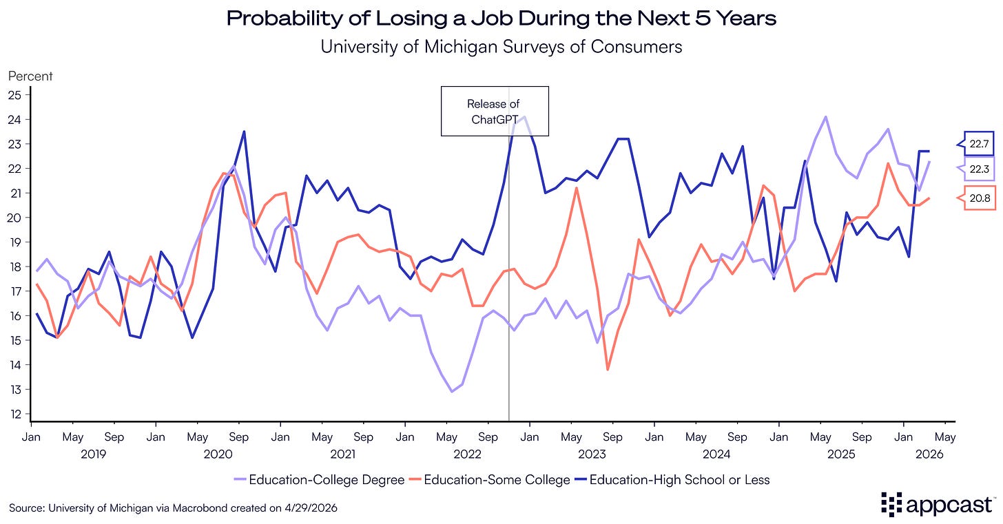 Interestingly, the data is broken out by level of education. Workers with college degrees have steadily become more pessimistic about the job market since mid-2023, just a few months after the release of ChatGPT. They believe that the probability of job loss within five years is now closer to 25%, compared to about 15% a few years ago. While the macro environment has deteriorated as well, this might suggest that educated workers themselves think of AI as a labor-displacing technology, at least in some cases.