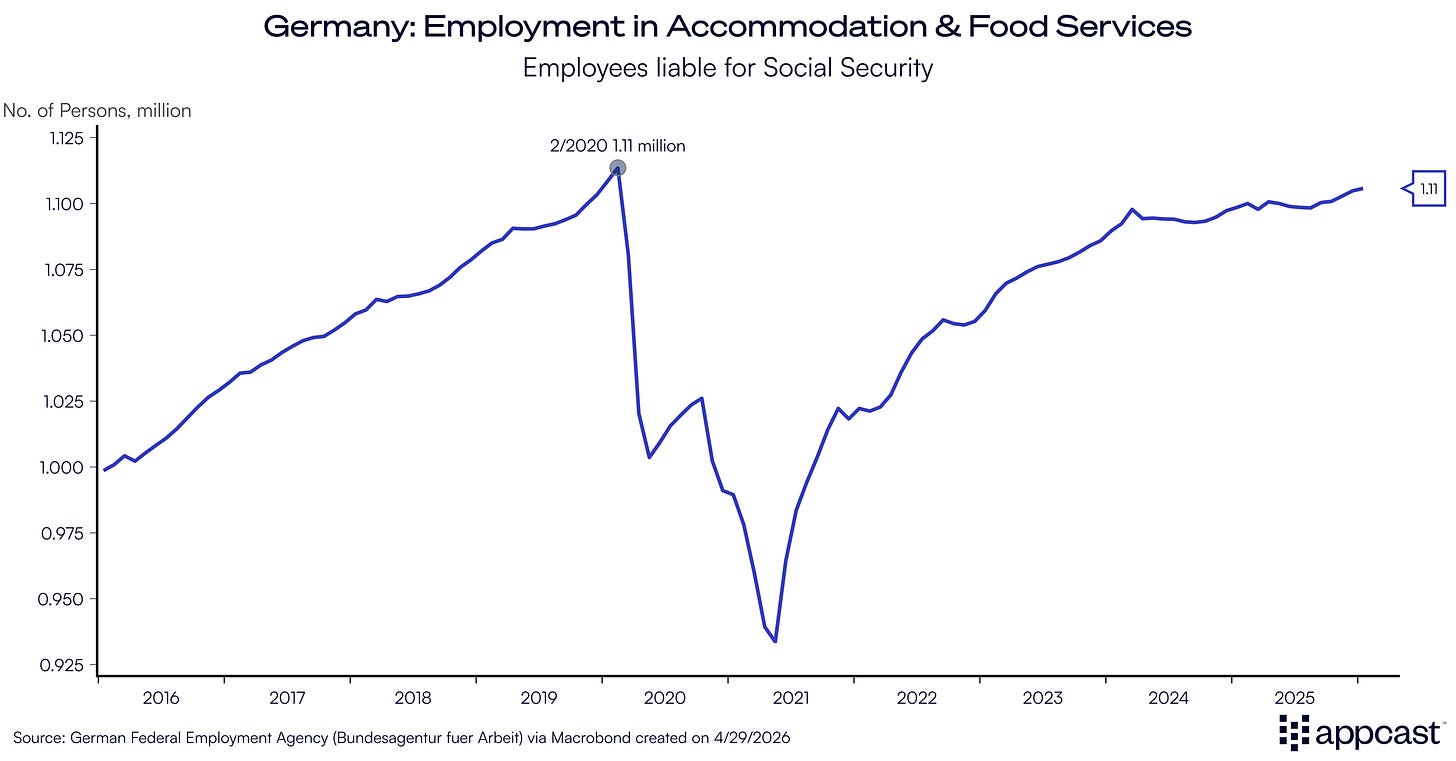 Thanks to the slightly better economic outlook this year as the German stimulus starts to kick in, hospitality looks set for a recovery, depending on whether German households will loosen their purse strings and start spending. In terms of employment, the sector is now finally back to where it was before COVID-19 hit the global economy six years ago.