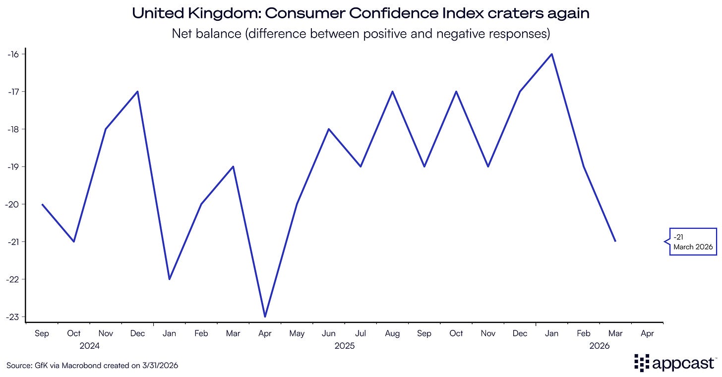 Well, so much for that! With global oil prices soaring due to the conflict in the Middle East, consumers in the U.K. are turning sour again. The Consumer Confidence Index shows that sentiment fell by 6 points to a balance of -21 in March, the lowest in a year. Higher energy prices and soaring interest rates will be an added financial burden to many households for months to come. This can only mean one thing: less income for discretionary spending — think fewer restaurant visits, fewer trips to the pub or the movies, or potentially one less vacation as airplane tickets are soaring.