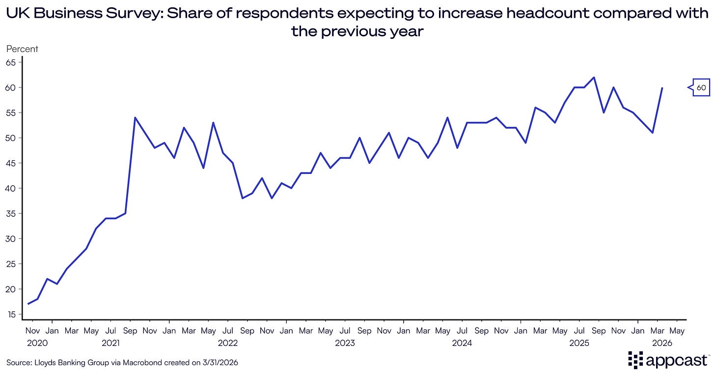 While other sentiment indicators suggest that U.K. employers are also getting more pessimistic about the economic outlook, data from the Lloyds Banking Group has a surprise in store. Their business barometer shows that the share of employers expecting to increase headcount ticked up quite noticeably in February compared with the previous year (from 51%to 60%.