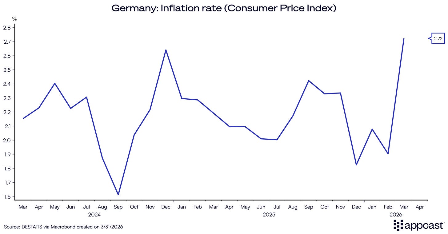 Germany — and continental Europe — are equally exposed to higher commodity prices. The German consumer price index (CPI) unexpectedly jumped from 1.9% in February to 2.7% in March, its highest leap in more than two years. While this is preliminary data and the subcomponents of the inflation data will only be published in April, there is no doubt that higher energy prices are driving the surge!