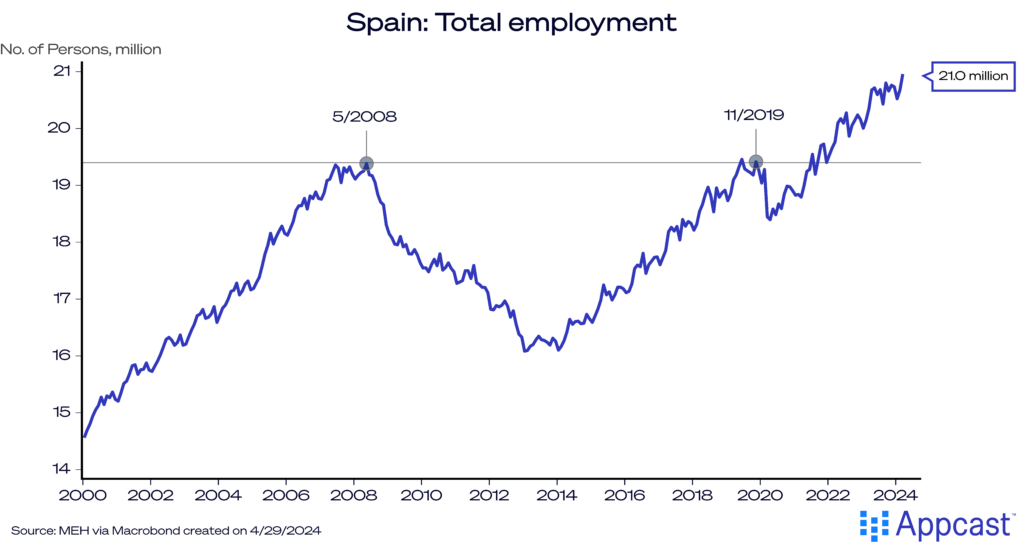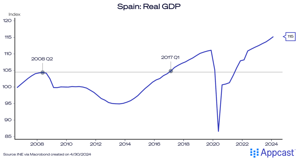 While The COVID-19 economic plunge was even deeper, it was very short-lived. Spain’s economy recovered by 2022 and is now close to 4 percent larger than in early 2020, making it one of the better performers within the Eurozone.