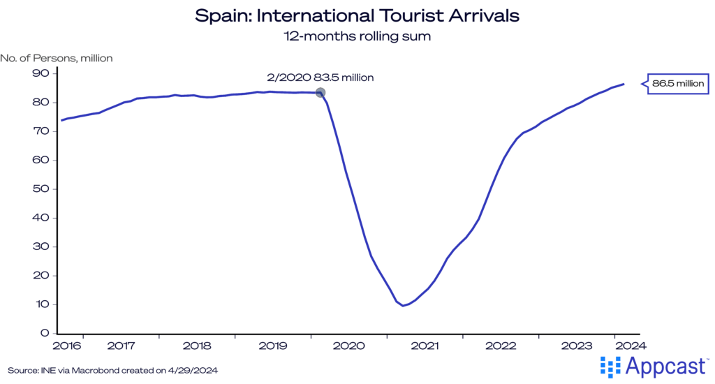 The global travel and tourism boom is one major factor that is lifting the Spanish economy right now. After global travel came to a standstill during the pandemic, tourism has now bounced back strongly and the number of international arrivals in Spain has exceeded 85 million in 2023, thereby surpassing the pre-pandemic peak.