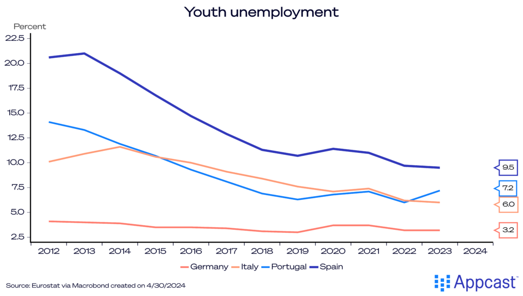 And even as economic conditions have recently, youth unemployment remains stubbornly high at close to 10%. For reference, this is roughly three times higher than the youth unemployment rate figure in Germany.