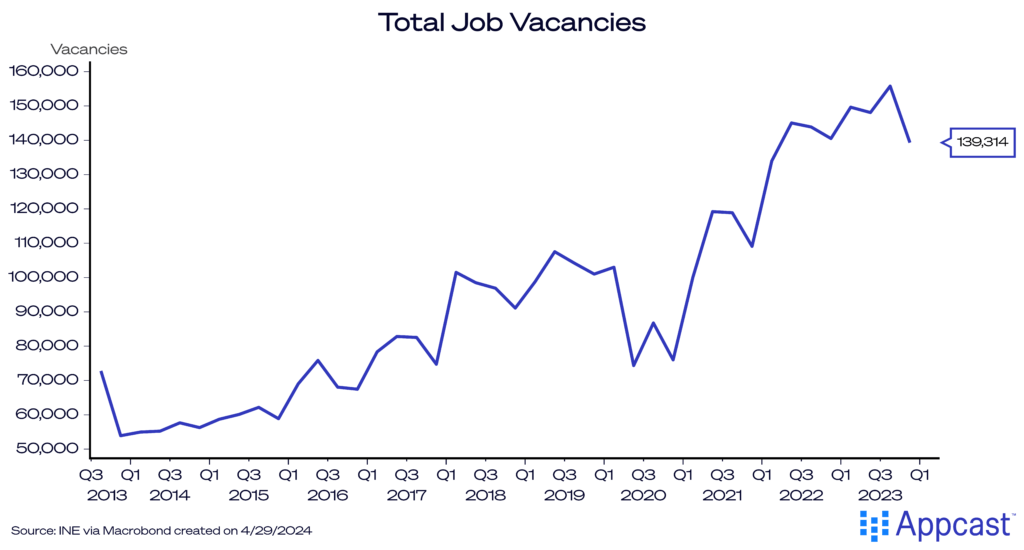 With the improving economy and labor market, job vacancies have surged in Spain above pre-pandemic levels and comfortably remain some 40% higher than 2019 levels, at least for now.