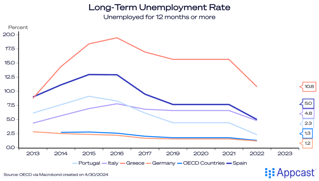 Despite its recent successes, there are structural problems that are holding back Spain that need addressing. Long-term unemployment, for example, continues to be a significant challenge for many Southern European economies, including Spain. Workers are long-term unemployed if they are looking for work for more than 12 months. While across OECC economies, long-term unemployment stood at less than 1.5%, it was more than three times higher in Spain (5%).