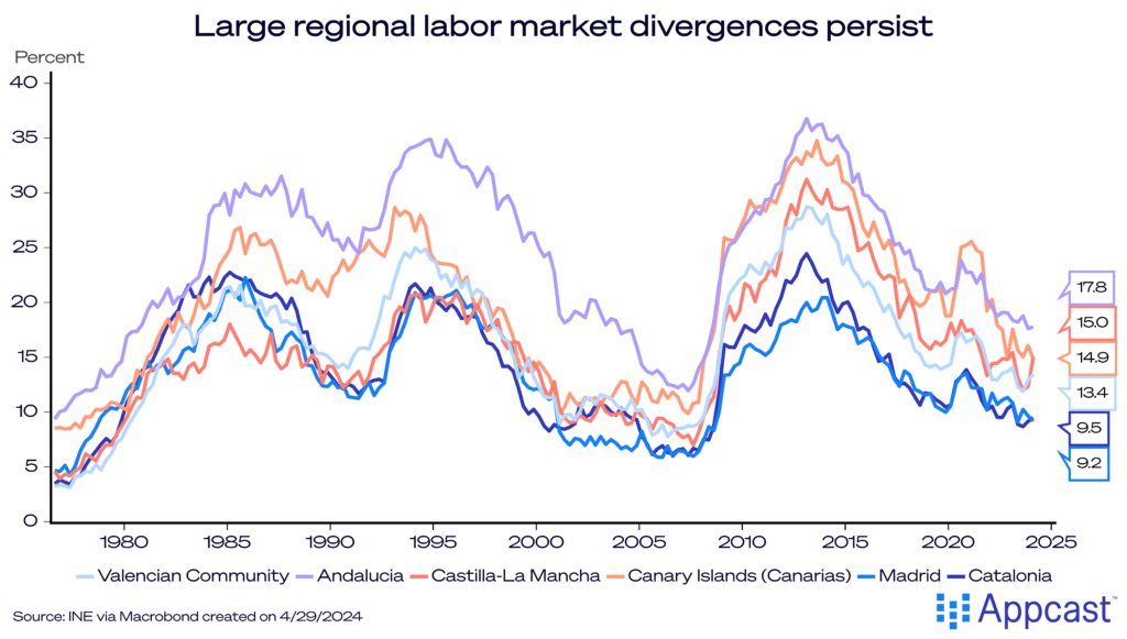 At the same time, Spain’s economy continues to suffer from some severe structural issues like chronic long-term and youth unemployment in some of its weaker regions.