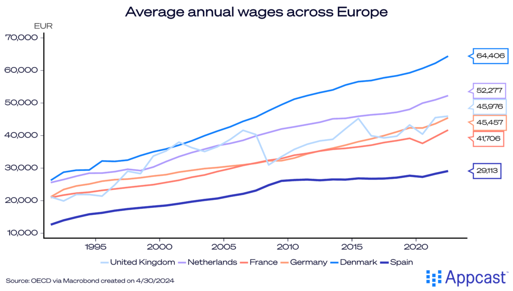 Nevertheless, with the rise of remote work since the pandemic, companies had a higher incentive to outsource certain functions to markets where they can attract talent at a cheaper cost. With Spanish wages in nominal terms being half of what they are in Denmark, for example, it makes sense for small startups or international businesses to broaden their recruitment to alternative markets with an existing skilled workforce.