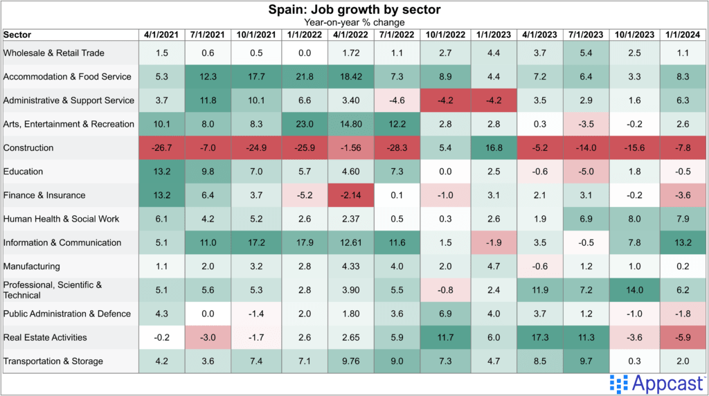 Employment in information and communication is growing even as other countries have seen temporary stagnation. The construction sector keeps adding jobs despite relatively high interest rates. Health and social work and professional, scientific and technical jobs are growing at a healthy pace of more than 6% year-on-year. Only real estate seems to be in a brief contraction right now, but job growth is generally healthy across all major industries.