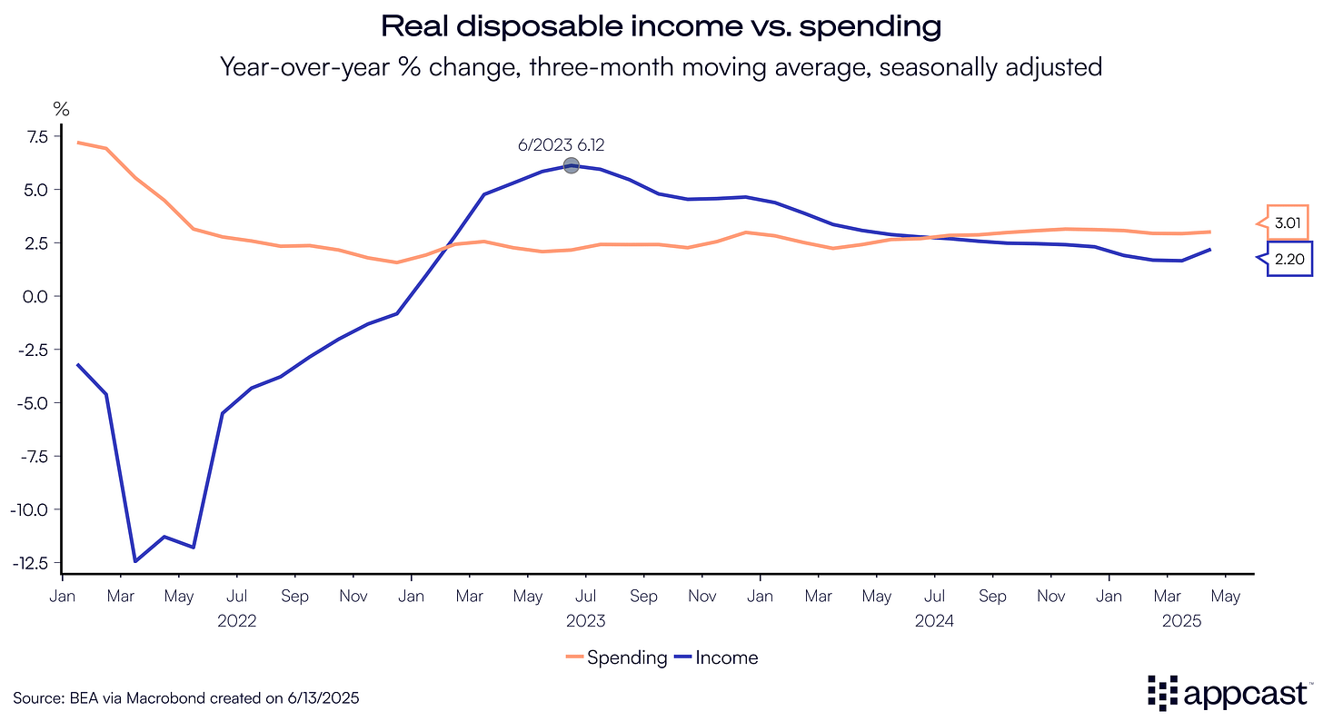 As that extra cash was gradually spent down, disposable income growth has cooled, even as consumer spending remained surprisingly resilient. Today, inflation-adjusted growth in disposable income has slowed to around 2% year-over-year. With less financial cushion, consumers may approach summer travel plans a bit more cautiously and prioritize certain trips over others.