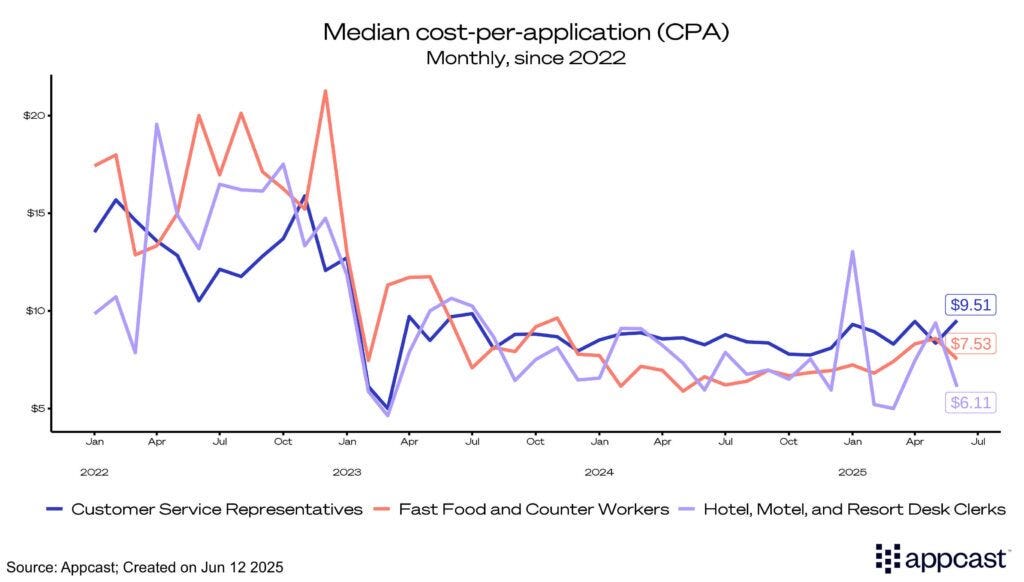 On the recruiting front, Appcast’s cost-per-application (CPA) data shows that much of the pandemic-era pricing pressure has eased. For many summer seasonal positions, CPAs have fallen to multi-year lows, with the median now below $10. In fast food, for example, CPAs that exceeded $20 just two years ago have declined by more than half, now averaging under $8.