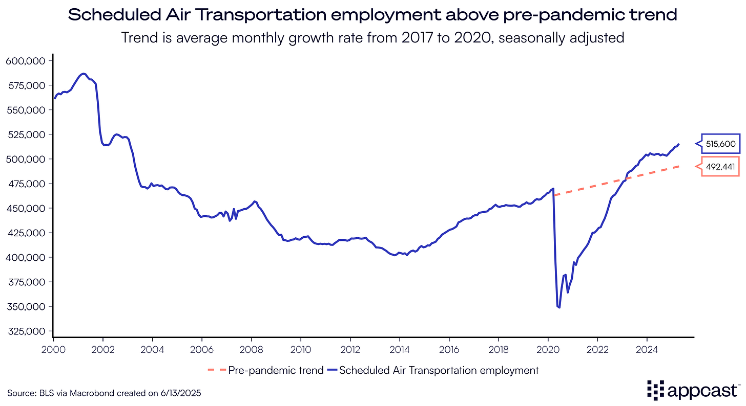 Still, the broader passenger airline industry has staged a strong post-pandemic recovery. The sector has fully regained all jobs lost during the pandemic and is now expanding at a pace above its pre-pandemic trend, fueled in part by a surge of “revenge spending.” This rebound has driven near-record employment growth and solid wage gains for flight attendants, pilots, and technicians.
