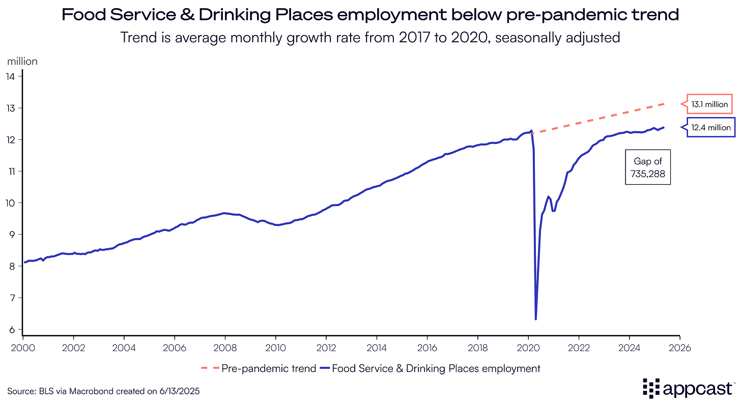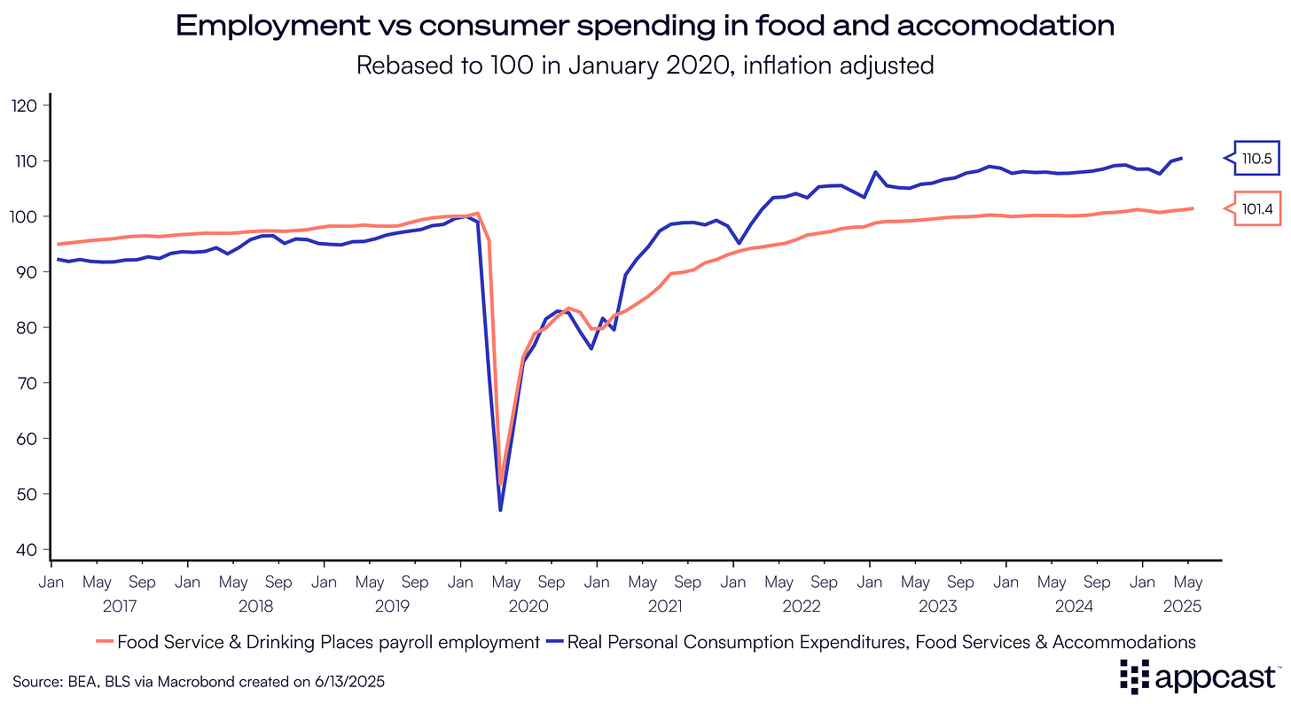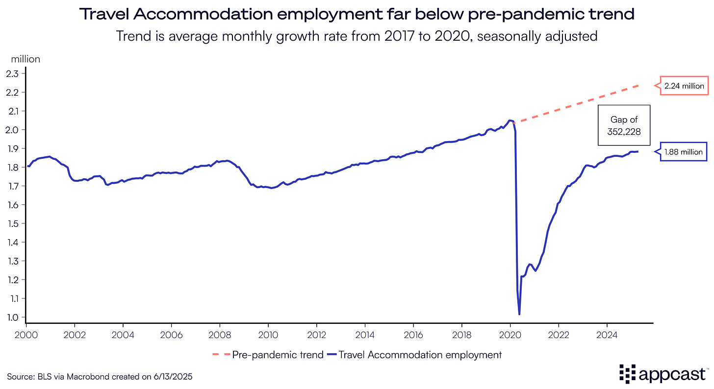 At the start of the year, hotel bookings data started to flash some early warning signs. Bookings fell 8% in the first quarter, likely reflecting a combination of fewer international visitors and a pullback in domestic business travel. Inflation-adjusted spending on hotels and restaurants rose just 0.8% year-over-year in the first quarter, a noticeable slowdown compared to the 2% to 3% growth rates seen in the immediate post-pandemic recovery. These softer demand signals could weigh on hiring needs as hotels plan for the peak summer season.