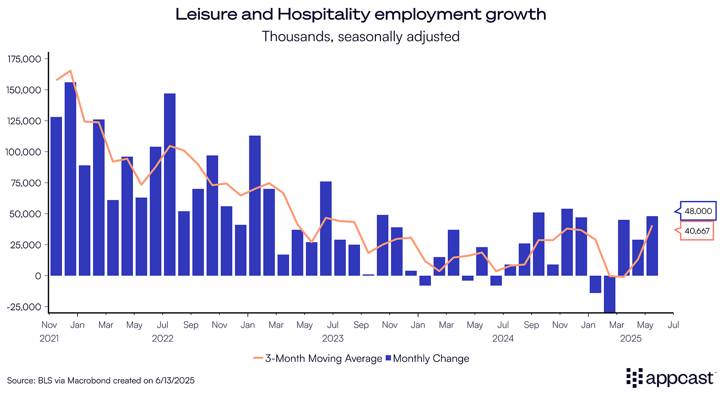 Leisure and hospitality has been one of the brighter spots in the labor market recently. The sector added 48,000 jobs in May, pushing its three-month average gain to nearly 41,000 — a solid pace of growth as employers gear up for peak vacation season. While headline job gains are encouraging, trade policy, consumer spending and travel patterns are adding layers of complexity to this summer’s recruitment strategies.