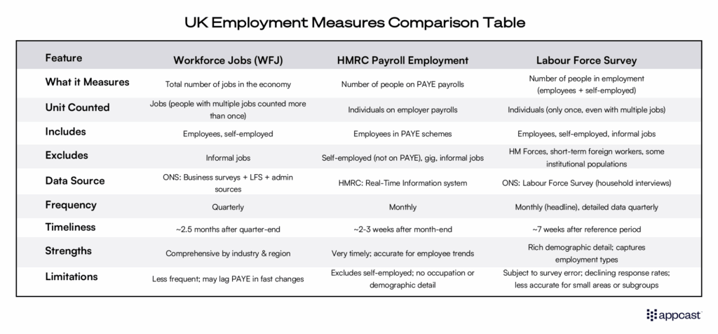 The third series, called “workforce jobs,”, is only released on a quarterly basis instead. It is collected through a combination of employer and household surveys as well as administrative sources. Furthermore, it does not count employed people but the number of jobs instead. Therefore, one person having two jobs would be counted twice.