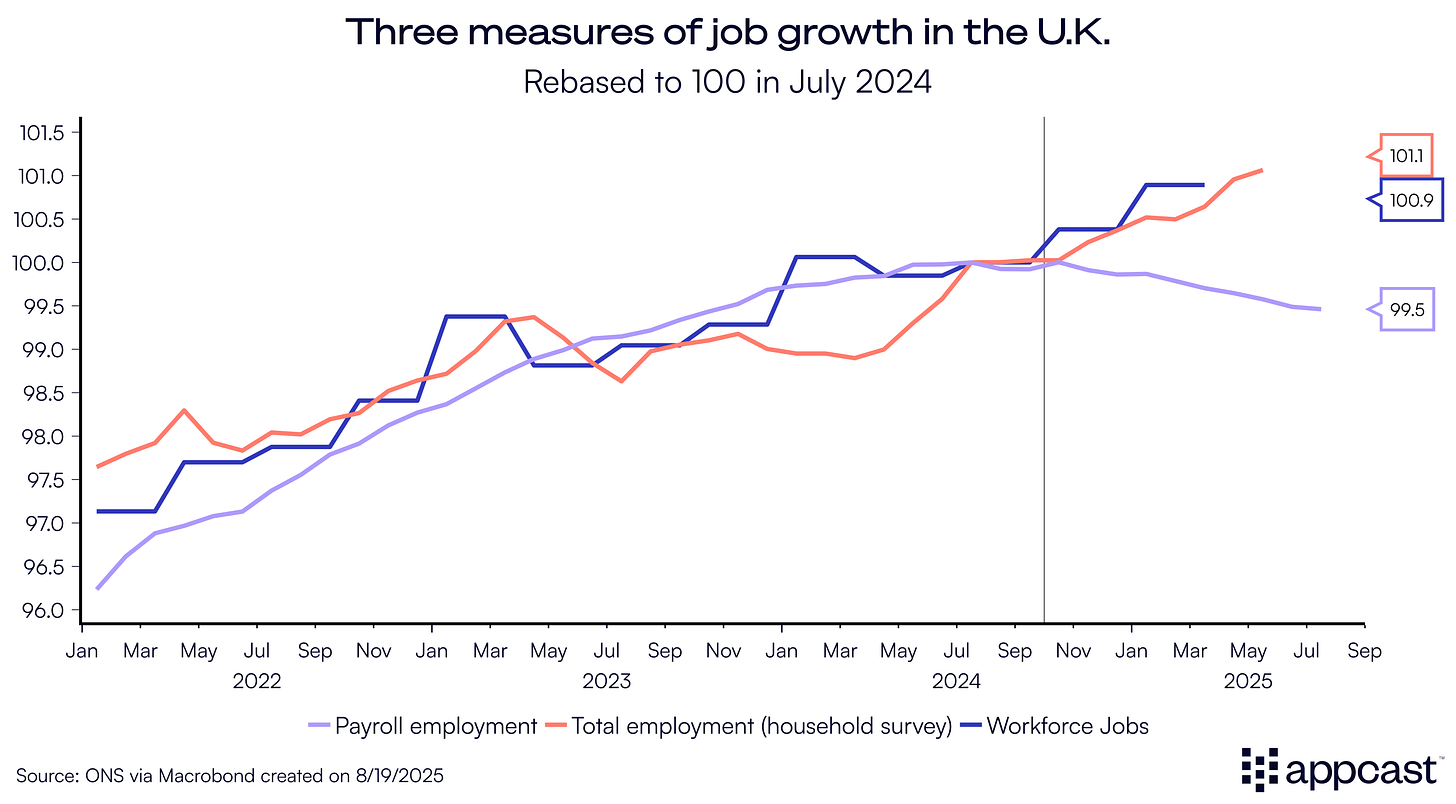 To complement the household survey, the ONS publishes two other employment series, which are based on different data collection methods and have different scopes. As a reminder, the employment series based on the household survey captures every single person employed in the U.K., including self-employment and gig work (even as the latter is hard to estimate).