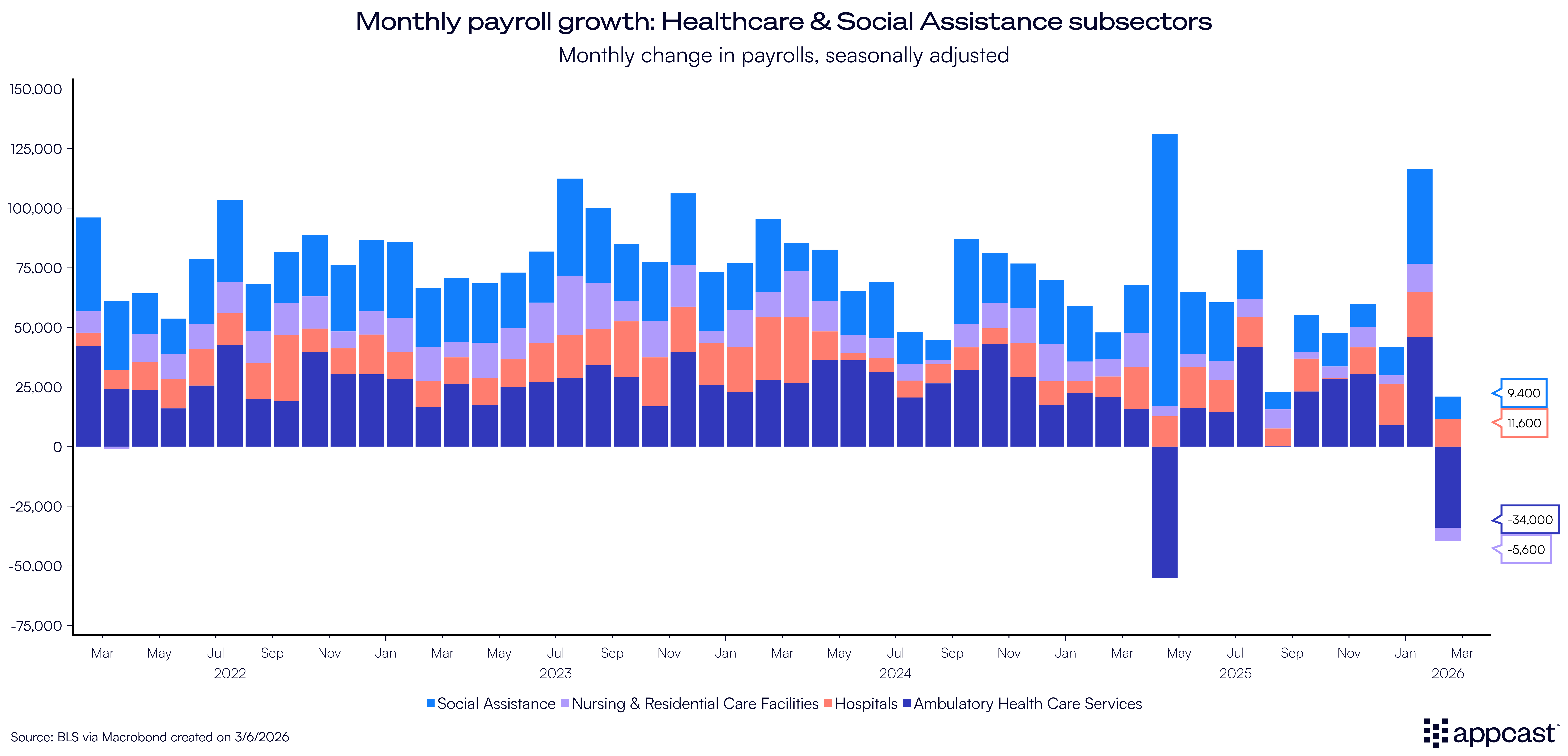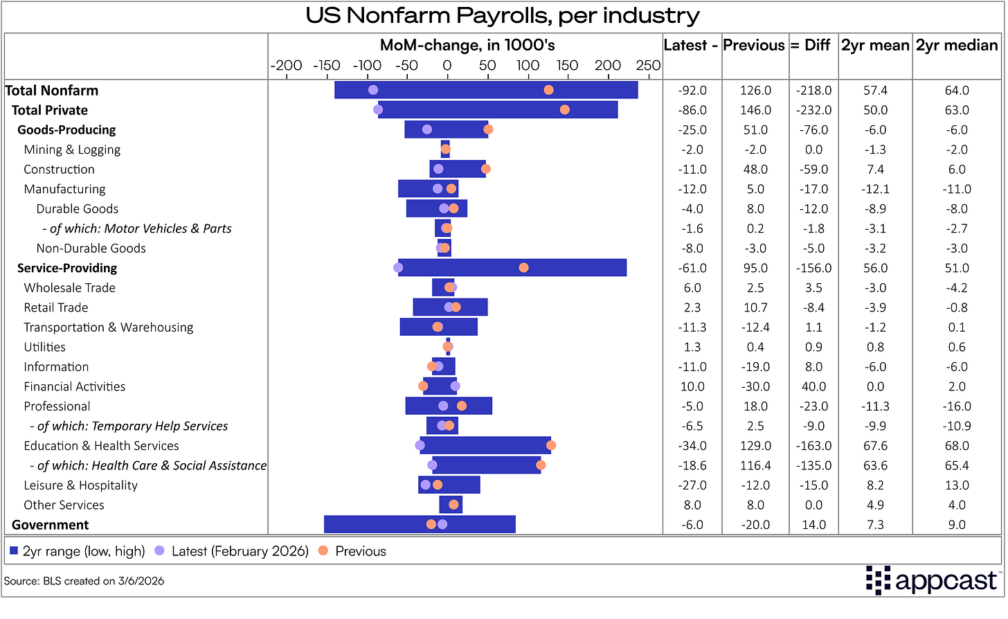 The headline number for the February 2026 jobs report is bad, but after you dig into the details – welp, it isn’t much better. There was a shocking decline of 92,000 jobs last month. An important factor was a Kaiser Permanente strike, affecting over 30,000 healthcare workers in California and Hawaii. Plus, federal government jobs declined by 10,000 amid a partial government shutdown. But those factors alone don’t explain away that this is the worst jobs report since the beginning of the pandemic.
