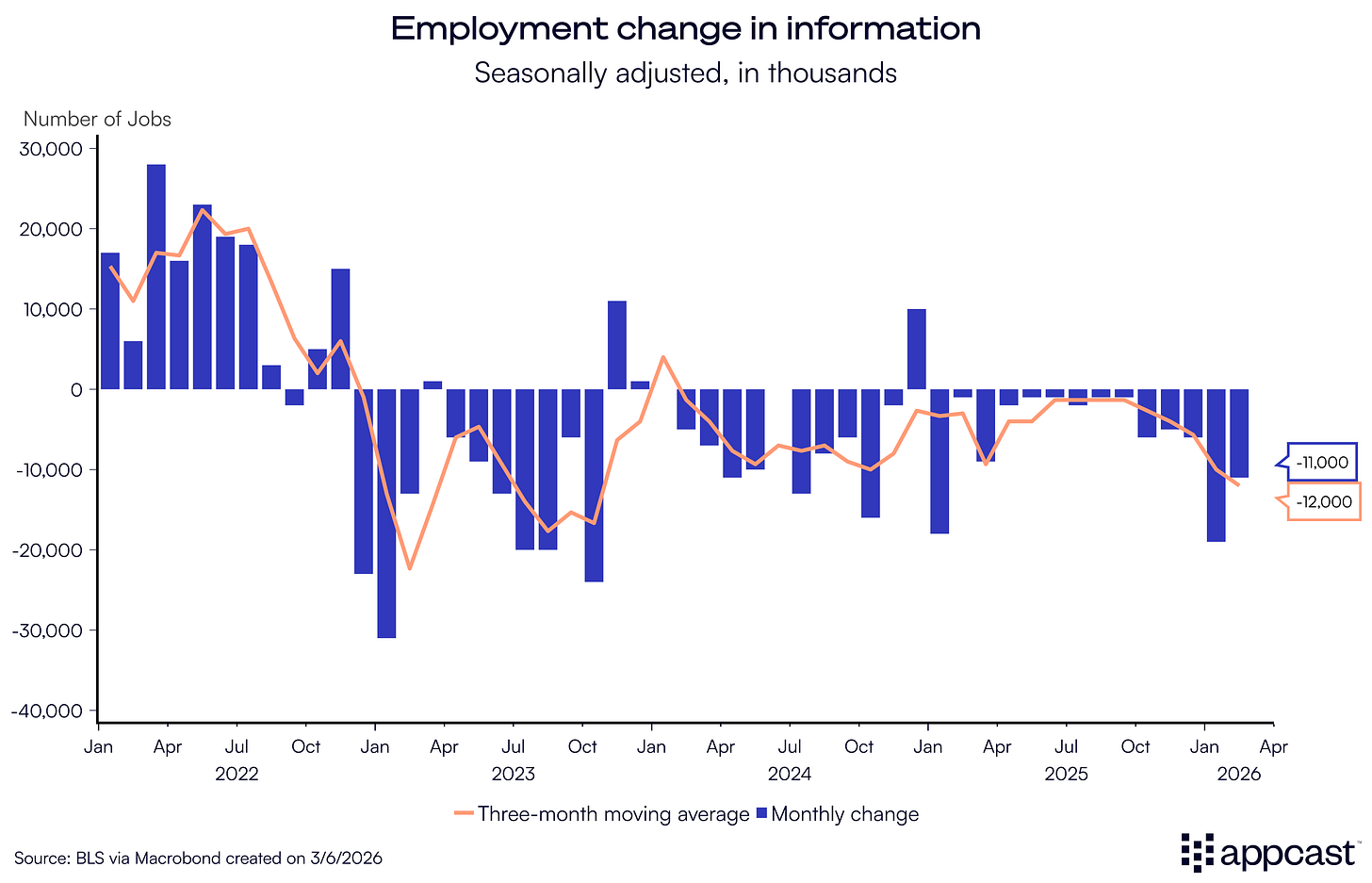 Then there was weakness in the Information sector, a rough proxy for tech hiring. Steady job losses there raise fears of A.I.-fueled displacement, whether rightly or wrongly. The combination of weak tech hiring and strong productivity figures from earlier this week will only inflame the A.I. debate.