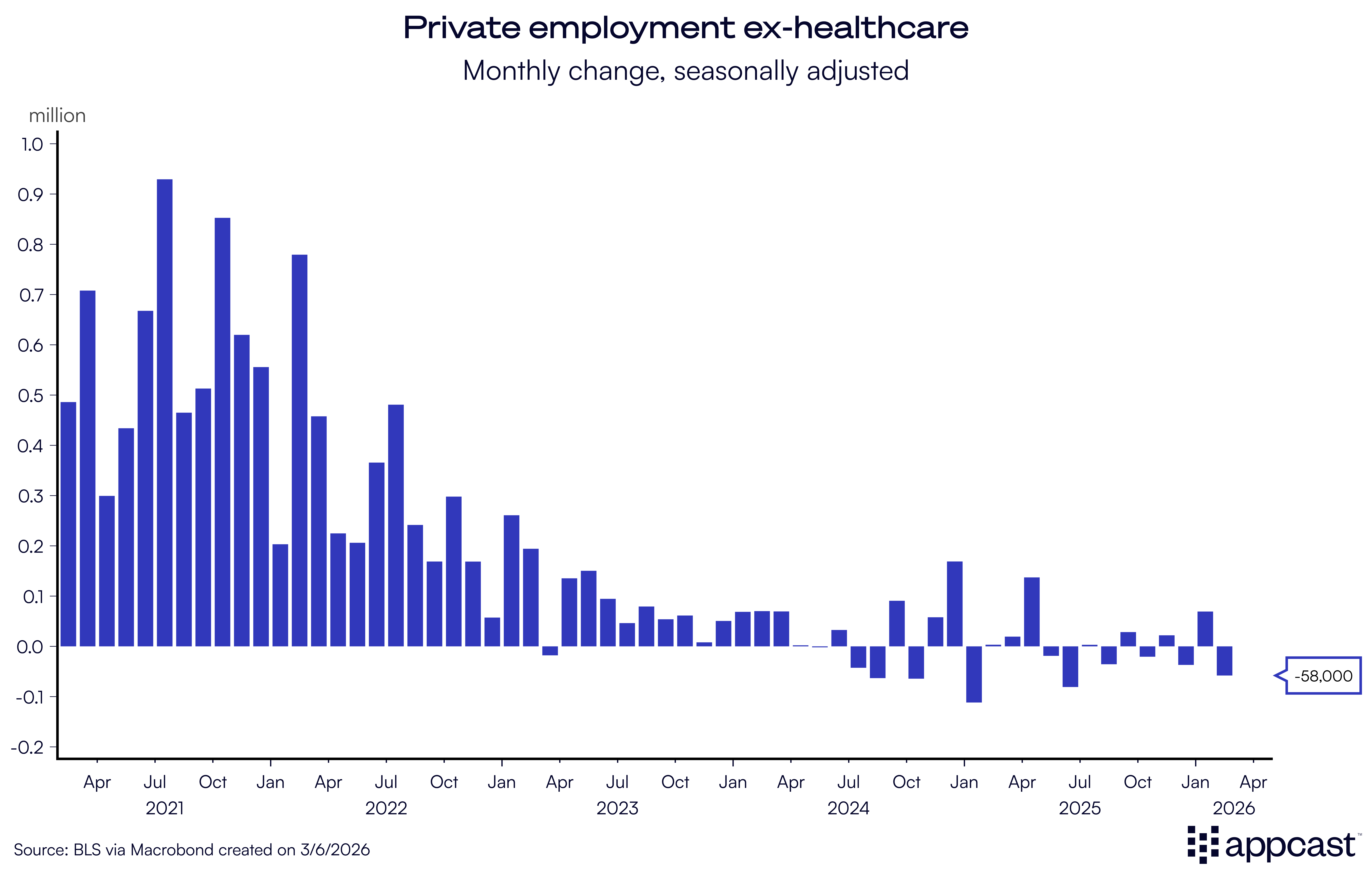 Looking at private employment excluding healthcare — so removing the two largest distortions in the data — still shows a decline of 58,000. When labor market growth depends on a single industry, we will inevitably end up with large swings like today.