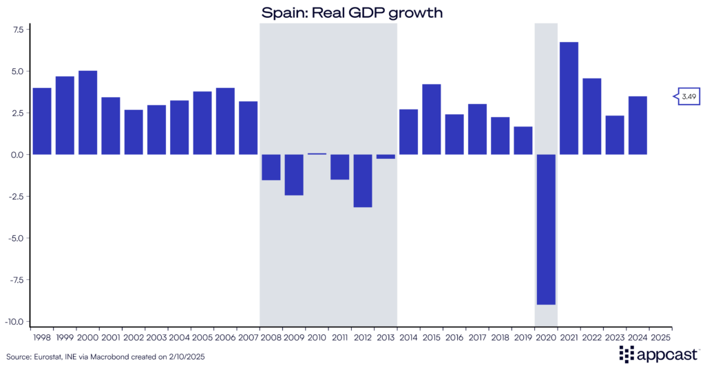 Similar to the U.K., Spain experienced a strong economy in the run-up to the financial crisis. Annual GDP growth exceeded 3% from the late 1990s until 2007 as Spanish income levels started to converge with Northern Europe.