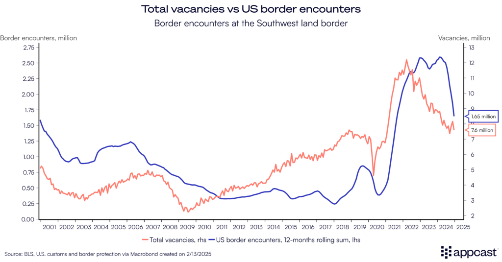 Obviously, there are also many other factors at play that influence immigration decisions. The deportations and general sense of unease put in place by the Trump administration are surely a deterring force. Push factors at home like climate change, political upheaval and weak domestic economies are all important contributors. However, the simple correlation between the strength of the U.S. labor market and illegal border crossings shows how labor market tightness is powerful force of attraction for international migrants.