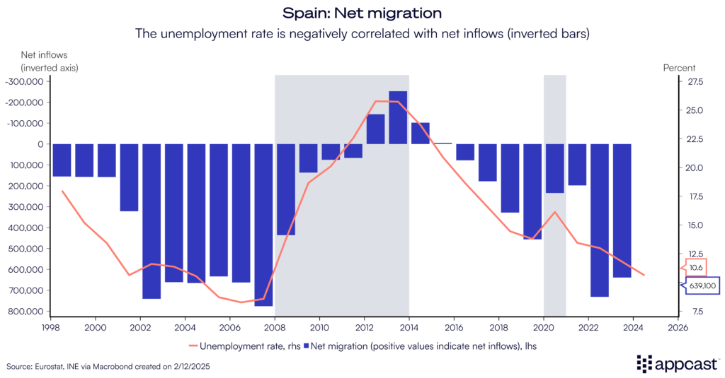 Following the collapse of the real estate market, unemployment soared from less than 10% to about 25% as the economy contracted between 2008 and 2013. Not only did inward migration collapse, but Spain started to experience net outflows at the time as many young and skilled Spanish workers fled their home country for better economic opportunities in Northern Europe (Germany and the U.K. being prime destinations).