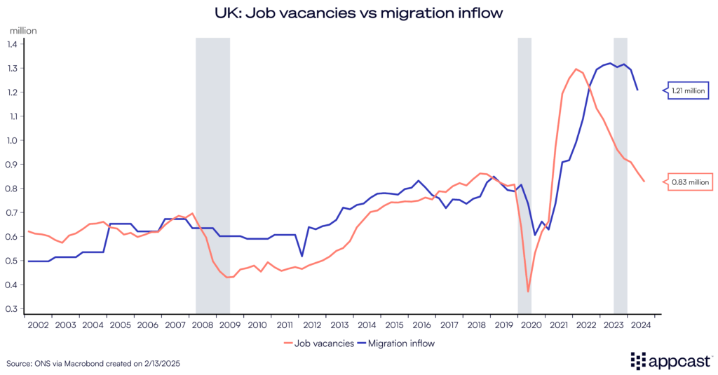 Revised statistics show that net migration to the U.K. exceeded 1.8 million between the summer of 2022 and the summer of 2024. We know that a large number of recent arrivals are international students, many of whom are expecting to stay in the U.K. to find work after graduation. There has also been a surge in work-related visas and dependent visas (family members).