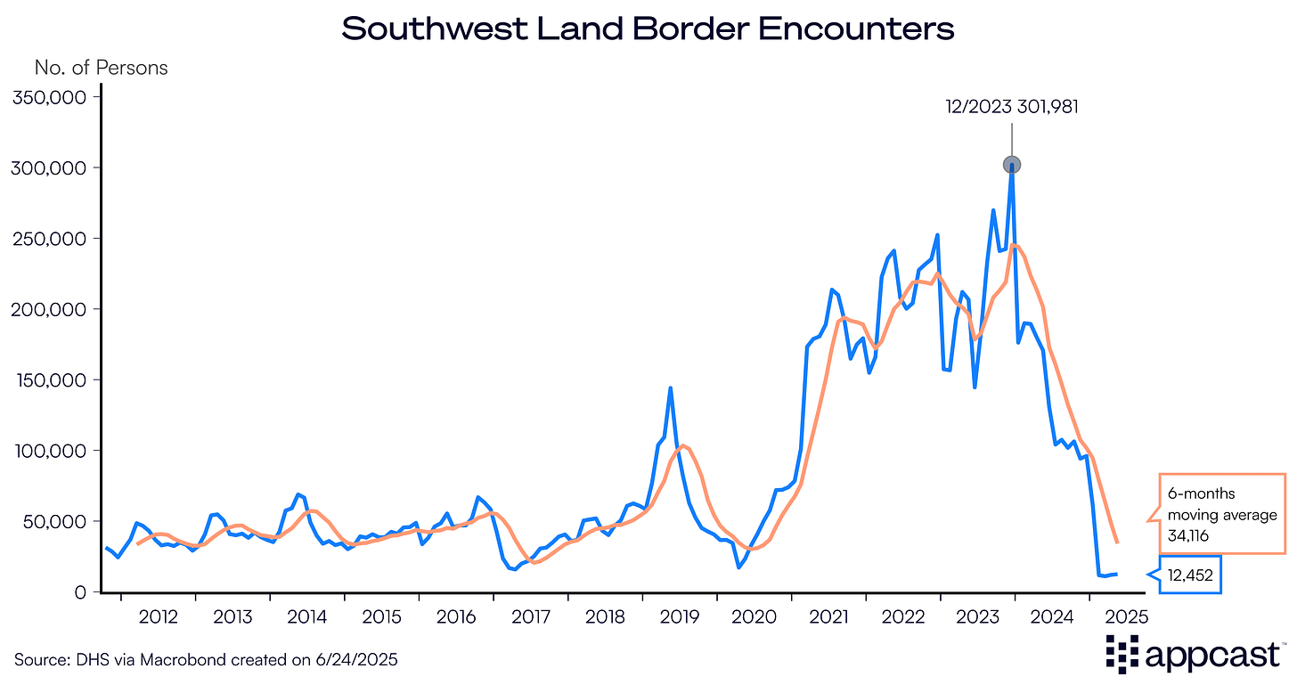 The bigger decline in immigration will come from the plunge of unauthorized crossings at the Southwest border. Encounters are down some 90% relative to their peak in 2023.