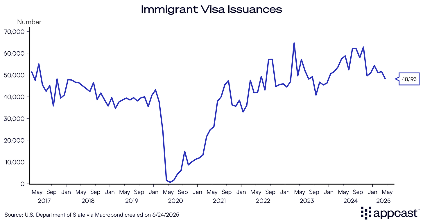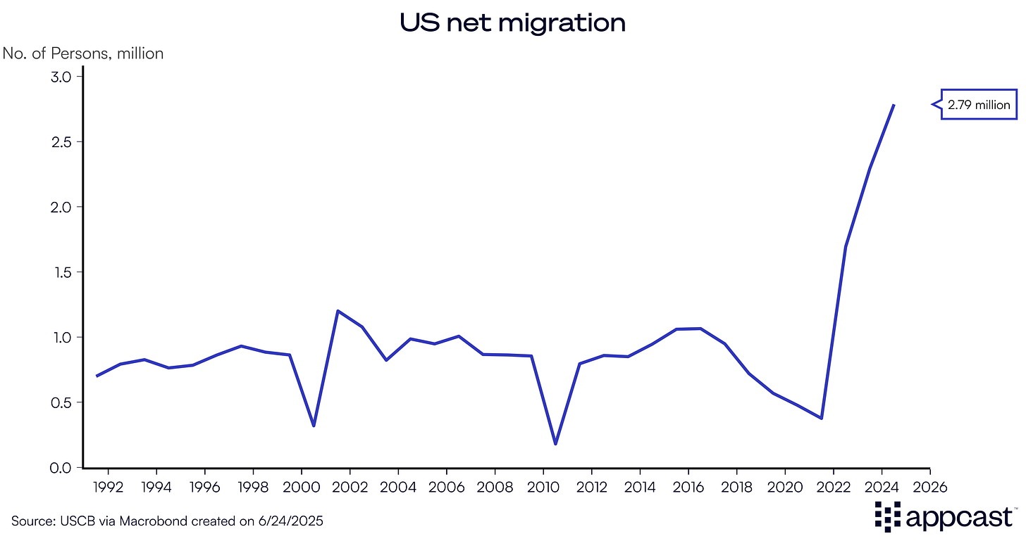 In practical terms, this reshapes the labor force in industries like agriculture, construction, and hospitality, where the presence of new, often unauthorized, migrant labor has historically served as a shock absorber for tight labor markets. Though the Trump administration has shifted its policy and pivoted away from conducting deportations in workplaces like farms and hotel, the decrease in migrant inflows will have an impact. While there may be upward pressure on wages in these industries, the broader economy is left grappling with the challenge of sustaining growth without the traditional pipeline of labor supply from immigration.