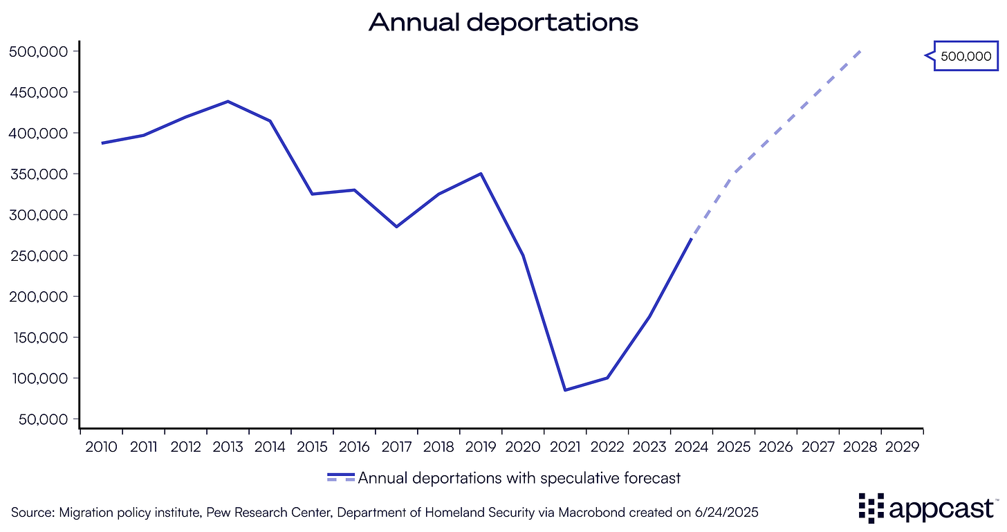 And that is a big if. Deportation capacity is constrained by logistical, legal, and political hurdles, requiring hundreds of billion dollars of investments in detainment facilities, transportation, increased border security, staffing costs, etc.