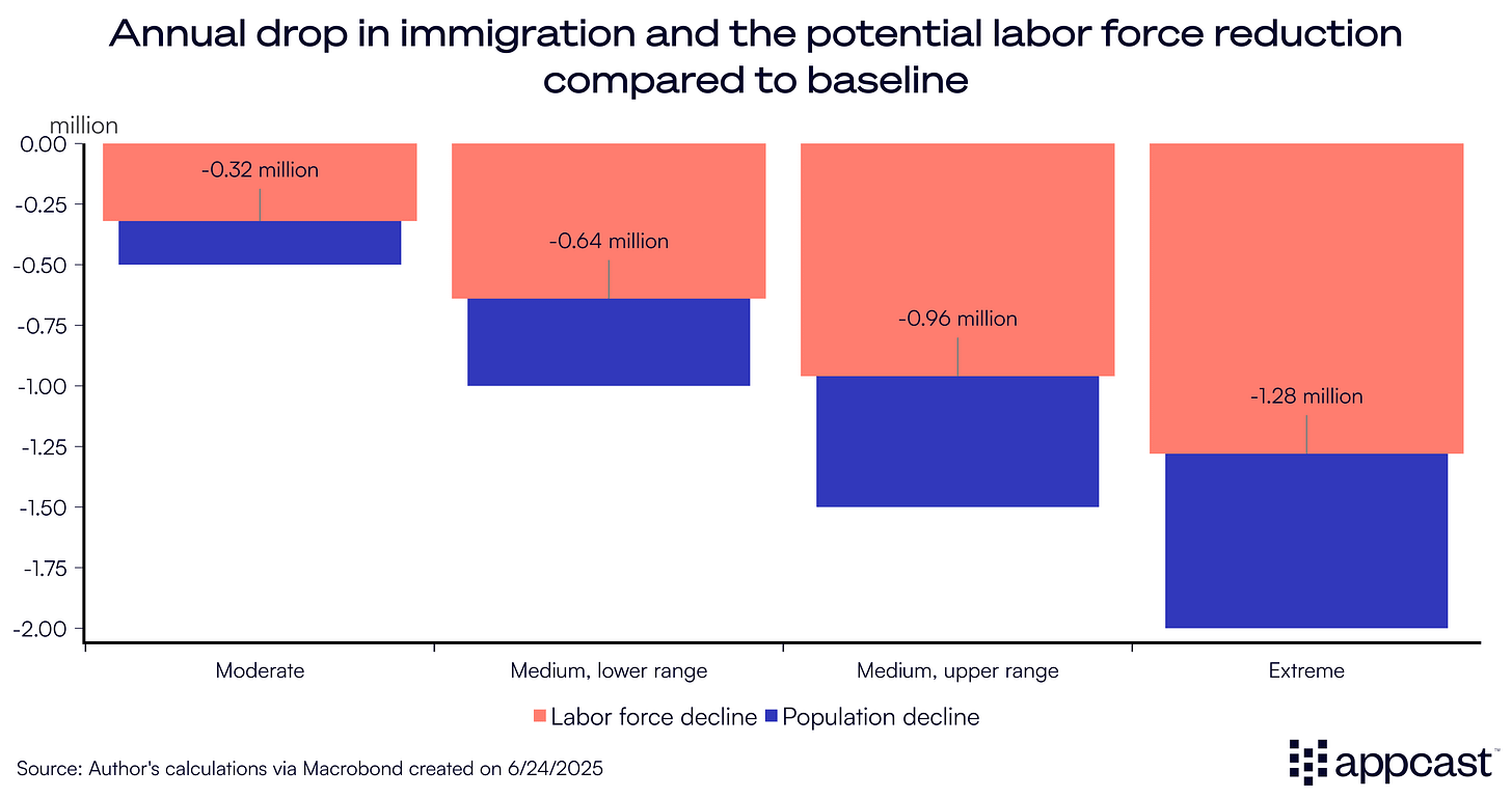 Such a steep decline in the immigrant workforce would obviously have severe implications for the economy (lower GDP) and labor market (the shortage of workers drives up wages). Quantifying the precise effects will be the focus of our upcoming piece.