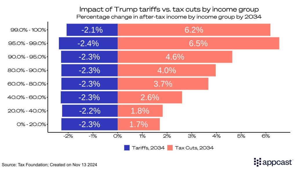 The effects of both tariffs and tax policy will ripple unevenly across the economy. For the highest earners (those in the 90th percentile and above) after-tax incomes are projected to rise significantly under the proposed tax policies. In contrast, the lowest earners, below the 40th percentile, could see their after-tax incomes decline. While lower taxes might offer some relief, the increased cost of goods driven by tariffs would more than offset those savings, disproportionately impacting lower-income households.