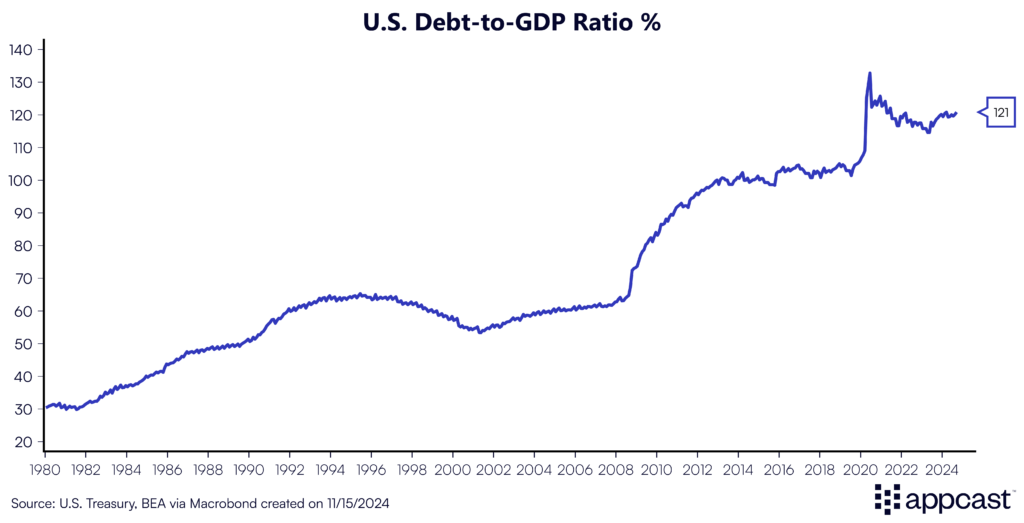 The increase in the long-term debt is what concerns tax experts the most: the gradual rise in the debt-to-GDP ratio is unsustainable and is forecasted to rise to 200% by the late 2040s. This comes at a time when debt-to-GDP is already at a near-record high at 121%. The market reaction was swift: bond yields surged the day after Trump’s election, signaling investor expectations of higher inflation and increased risk in lending to the government.