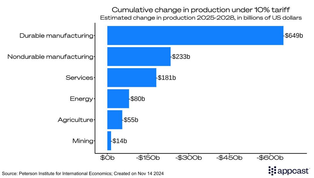 The effects of universal tariffs would not be evenly distributed across the economy, with the manufacturing sector expected to bear the brunt of the impact. Durable goods manufacturing—industries producing items like cars and washing machines—is projected to lose nearly $650 billion in production. Similarly, nondurable goods manufacturing, producing products like clothing and food, could shrink by $233 billion.