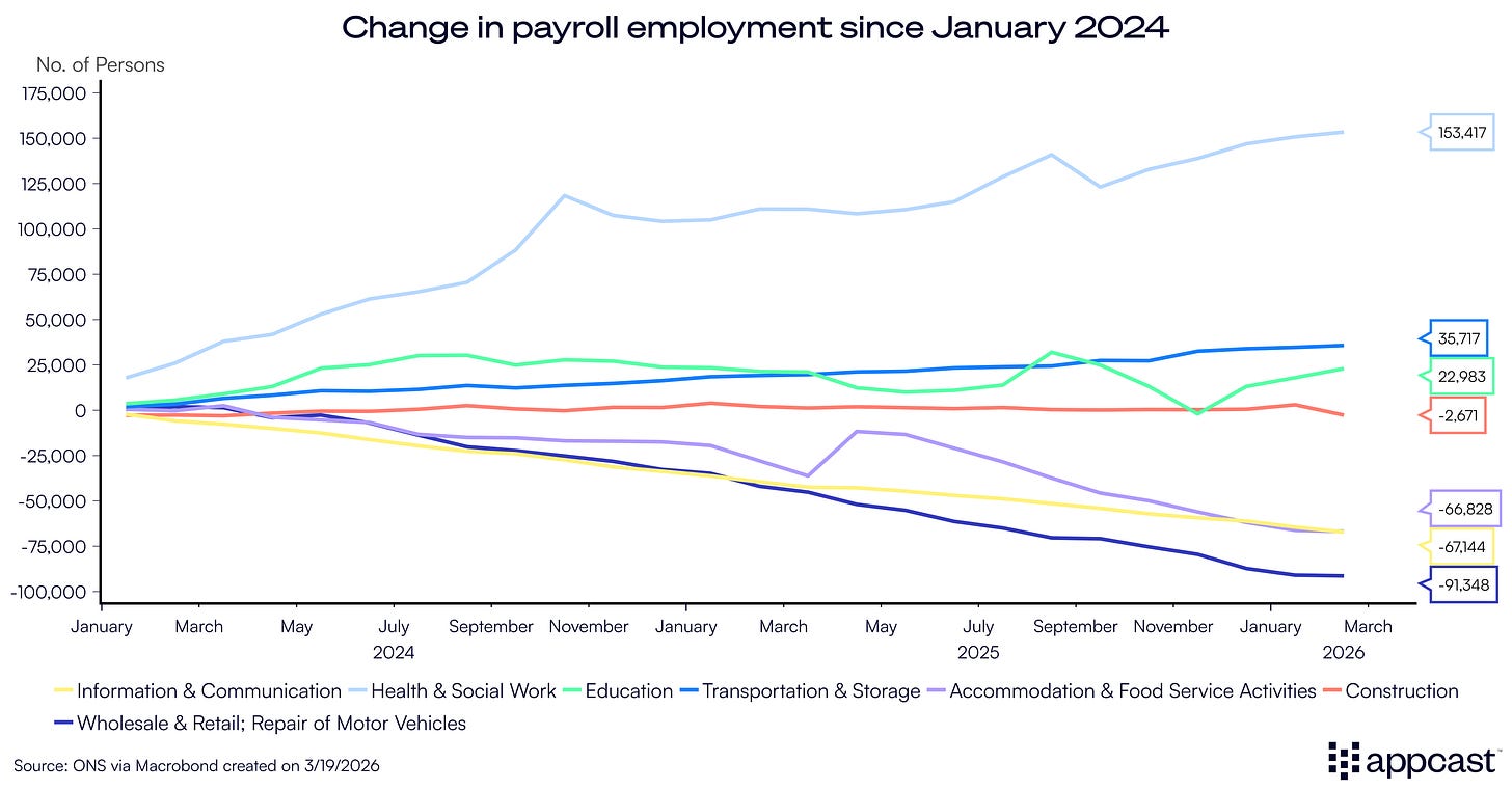 In terms of sectoral performance, there is little meaningful change compared to previous data. Accommodation and retail remain the two sectors with the highest cumulative job losses since January 2024 — exceeding 90,000 and 65,000, respectively. Both sectors have been affected the most by the large increase in employer costs due to the successive minimum wage hikes and tax increases implemented by the Labour government.