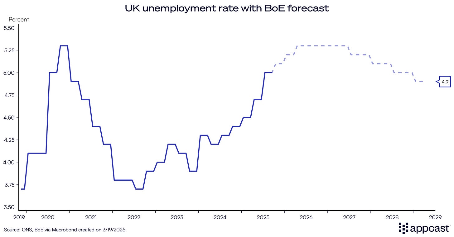 Let’s start with the labor market data. After increasing throughout most of last year, the unemployment rate has kept steady at around 5.2%, showing signs of stabilization. For now, monetary policymakers expect unemployment to peak at around 5.3% later this year before starting a gradual decline. However, this forecast is subject to change, given that a prolonged oil price shock could significantly harm labor markets across advanced economies.