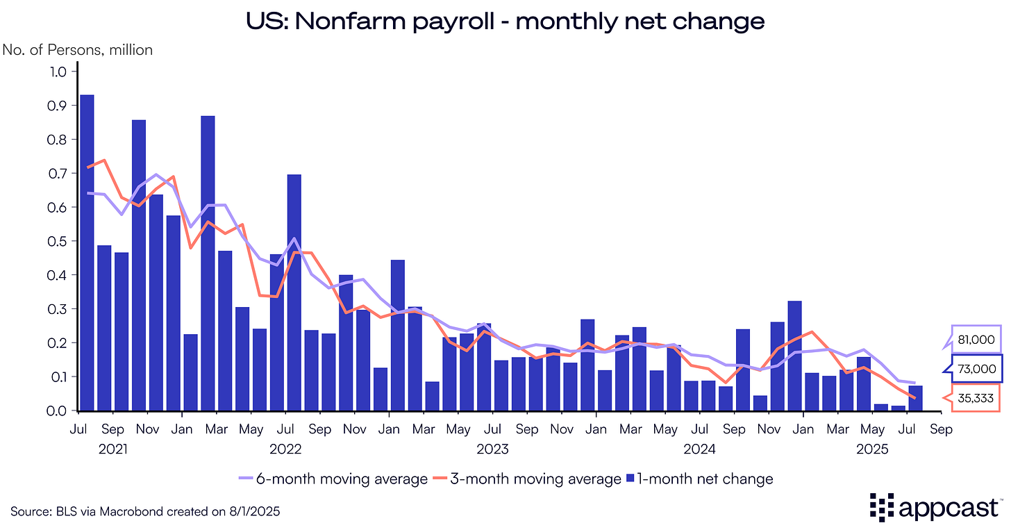 In summary, the labor market is cooling more rapidly than anticipated, with July adding just 73,000 jobs and sharp downward revisions to previous months suggesting even weaker momentum. Employment growth is no longer keeping pace with what’s needed to maintain the current unemployment rate, which has now edged up to 4.2%.