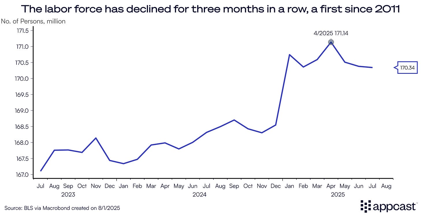 Immigration policy is also impacting the workforce: the labor force declined for the third month in a row—for the first time since 2011. Since April, the total civilian labor force has declined by 793,000, a drop rivaling the workforce decline seen during the Great Recession in the late 2000s.