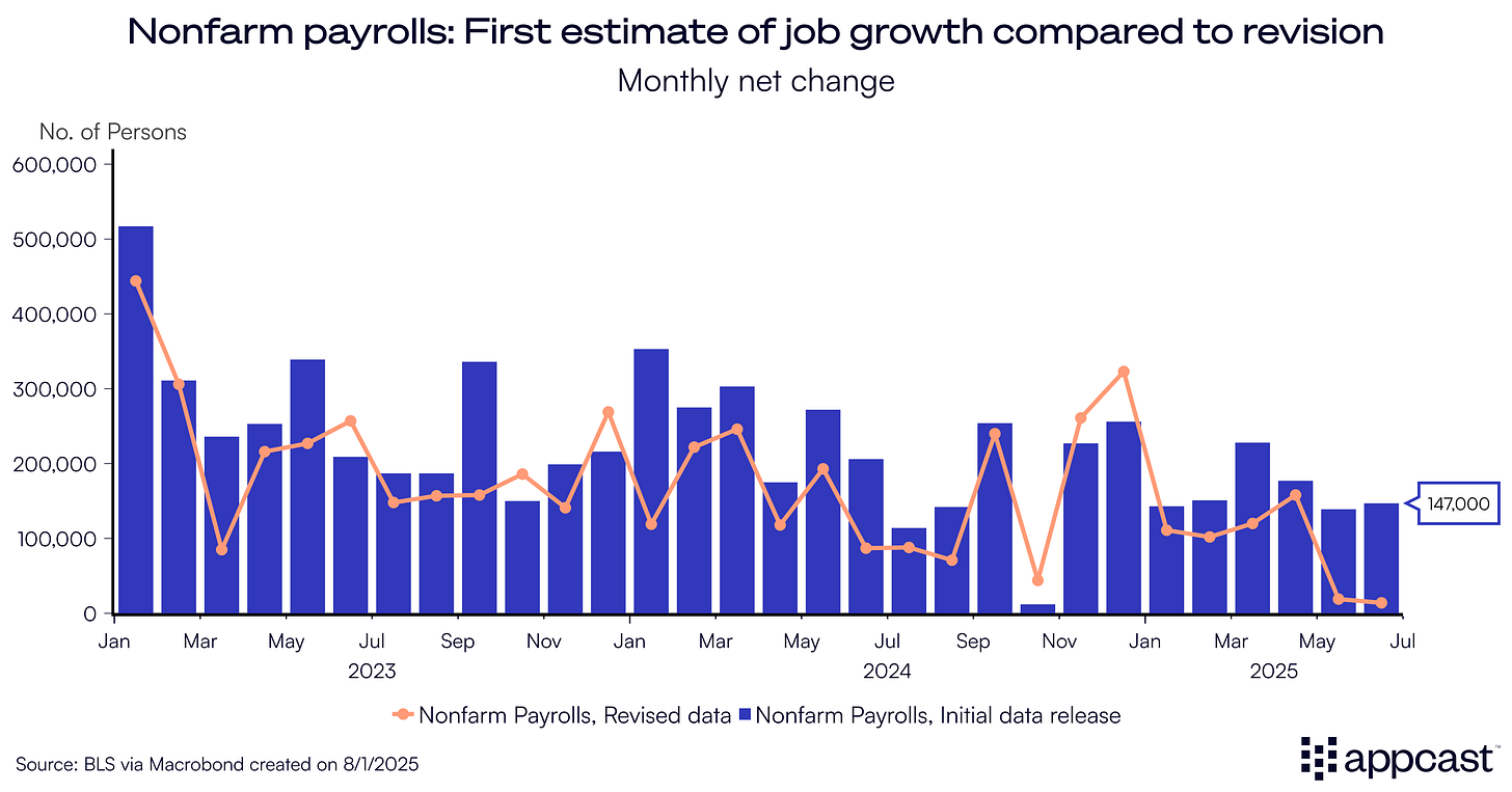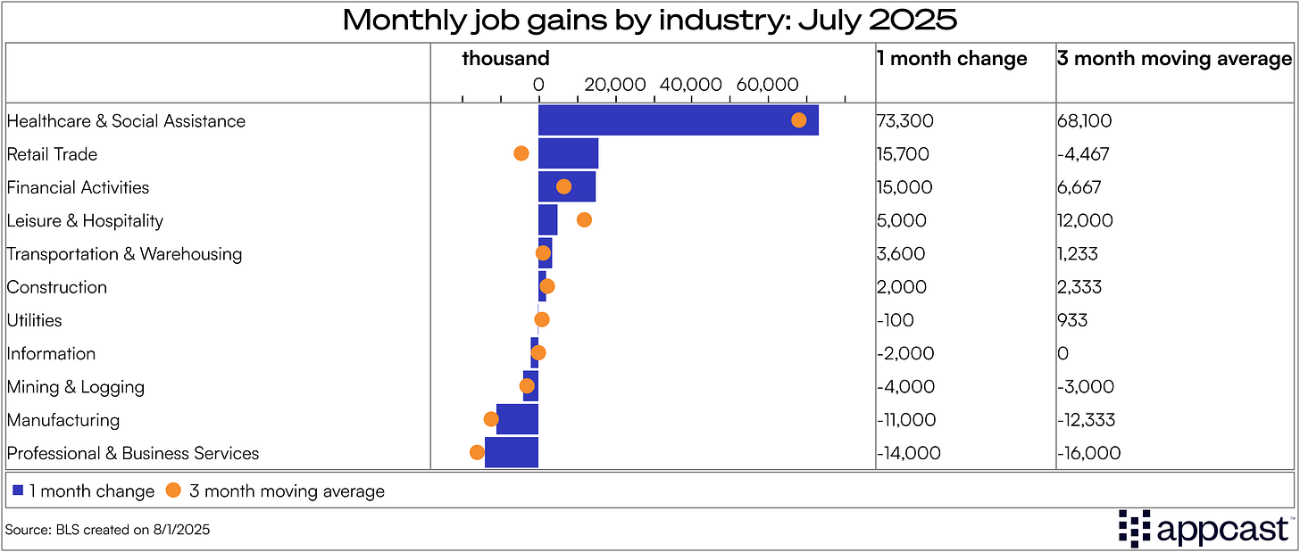 Another eye-popping figure from this report was a massive downward revision to May and June’s job growth. Both months were initially reported to show modest growth—now much weaker than previously thought.