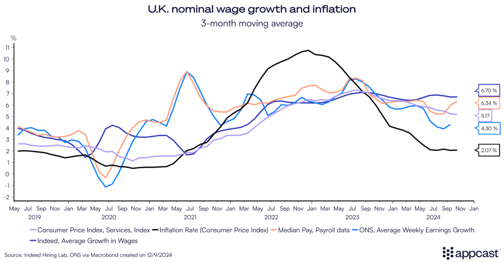 Unlike Germany, real wages are growing at a healthy rate in the U.K. again. While inflation has fallen rapidly since 2023 and is now basically back at target (2%), nominal wage growth has remained incredibly sticky. In fact, salaries continue to grow at a rate of over 6%, depending on the precise measure you use.