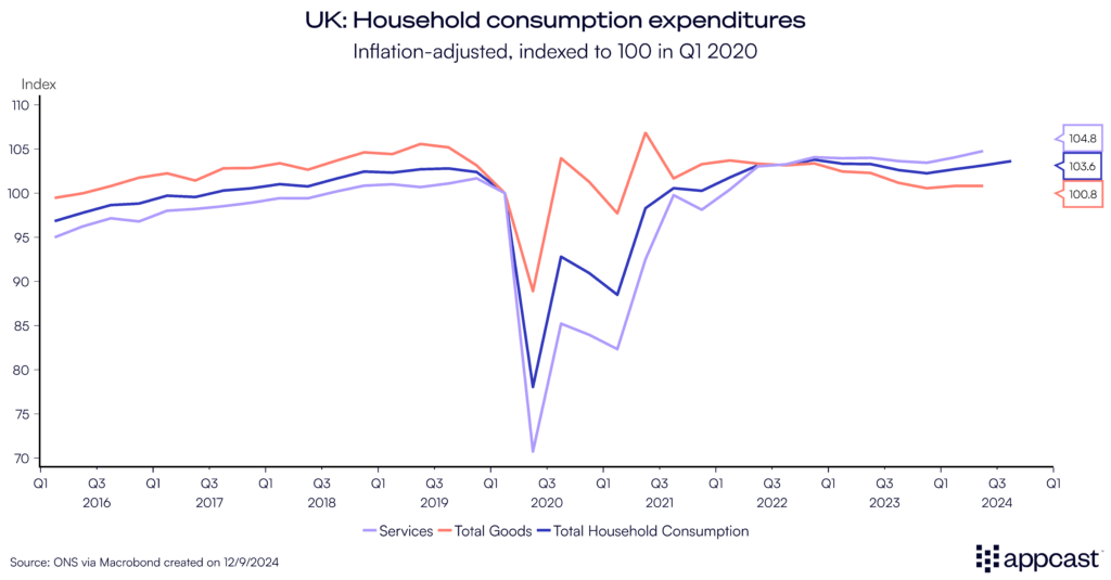 Looking across to the other side of the Channel, one can see that U.K. households are behaving in a very similar way to their continental European counterparts, saving way more than before the pandemic. Household consumption in inflation-adjusted terms is up by less than 4% since 2020. This better performance is due to slightly higher growth than in Germany, but overall, still a mediocre increase compared to the U.S. Spending on goods in the U.K. has been flat since 2019 while spending on services has gone up by close to 5%, leaving overall consumption slightly higher.