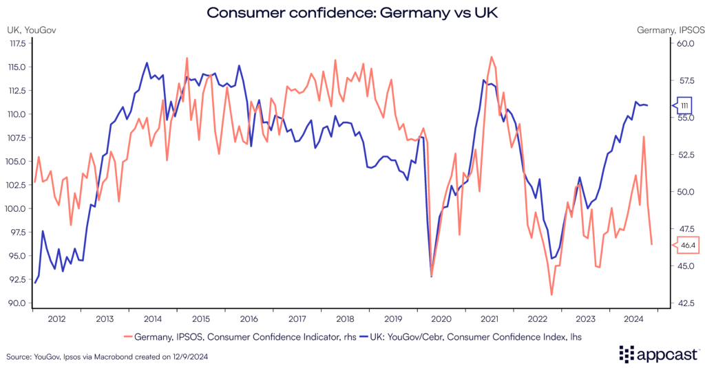 Even though European labor markets have been relatively stable since 2020, real wages have failed to keep pace with inflation, eroding purchasing power and dampening consumer confidence in countries like Germany and the U.K. This, in turn, has stifled domestic demand, a key driver of economic growth. The result is a self-reinforcing cycle of weak consumption and sluggish business investment, exacerbating Europe’s broader economic malaise and stalling its post-pandemic recovery efforts.