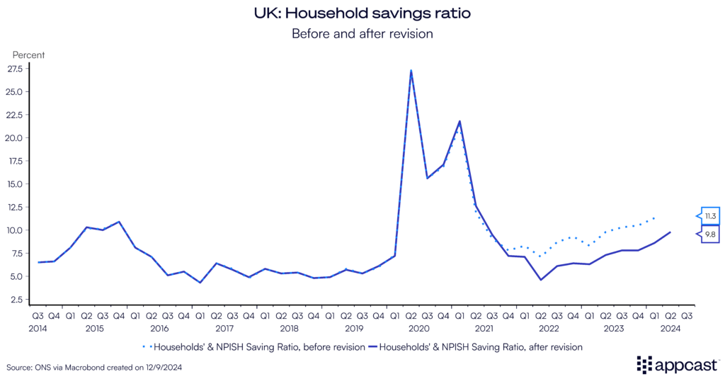 For British households, the saving rate averaged some 6.5% between 2014 and 2019 (in the immediate years before the pandemic it was closer to 5%). Since 2022, the saving rate has increased by several percentage points, now at 10%.