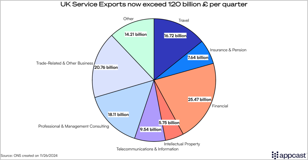 £25 billion in quarterly exports to the rest of the world are coming from the financial sector. This includes Fintech solutions (using Revolut or Wise for cross-border payments), investment banking services, asset management, merger and acquisition advisory services, etc. Some £18 billion are coming from professional and management consulting services. Accounting and auditing services are another big U.K. export. And £17 billion comes from travel (tourism is classified as an export).