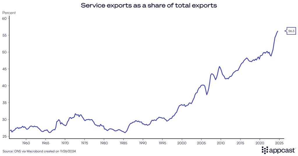 In fact, more than 55% of the U.K.’s exports to the rest of the world are services. As a point of comparison, for most other advanced economies, such as France, that value stands closer to 30% or even lower (about 20% for Germany). And since there are no physical goods crossing borders, service exports are not subject to tariffs.