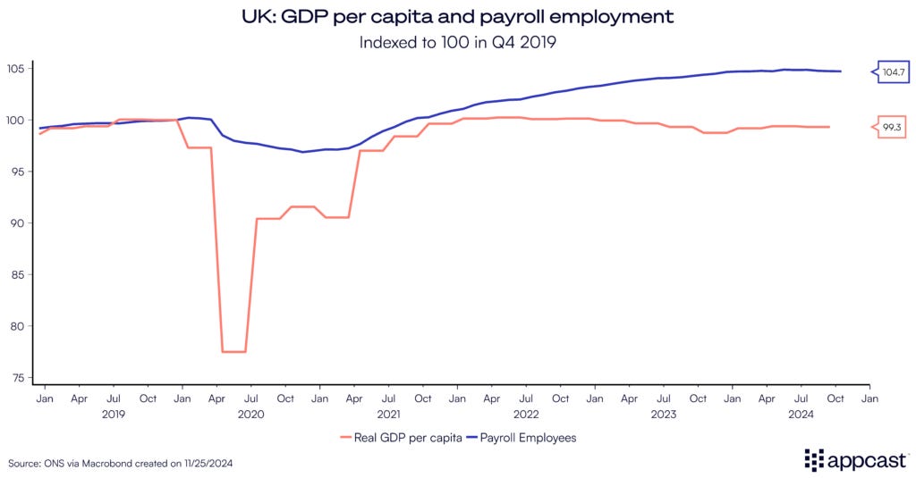 The U.K. economy has faced various headwinds over the last couple of decades. Austerity in the aftermath of the financial crisis was a big mistake, then Brexit probably shaved off about 4% from per capita incomes in the U.K. The recovery from the pandemic has been anemic as high interest rates to contain inflation have been constraining economic growth. Payroll employment growth initially surged throughout 2021 and 2022 but has also been completely stagnant this year. Per capita GDP is no higher than in late 2019.