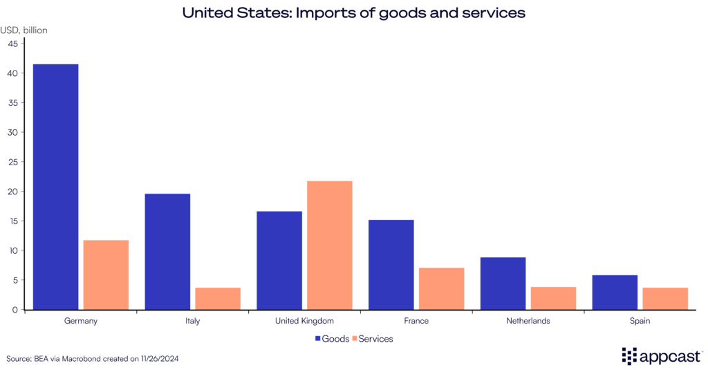 Not all European economies are equally vulnerable to Trump’s policies. Germany’s large export exposure means its economy will suffer the most from a trade war. Other large EU countries like Italy, France, and the Netherlands also export a lot to the U.S. and will be negatively affected by tariffs.