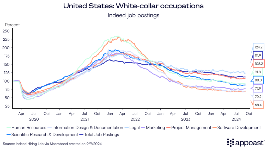 But the hiring boom of 2021 has now completely reversed as overall demand in the economy has normalized. As a result, job postings for many white-collar roles like software development have fallen rapidly.